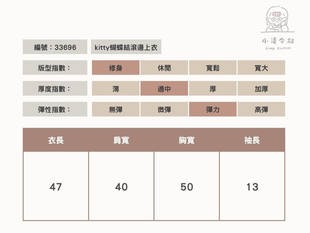 商品詳情 Model:163cm / 55kg 每件商品皆為手工測量,尺寸可能有正負3cm的範圍。 下單前可私訊IG客服詢問尺寸及適合尺寸建議。 商品材質:95%棉、5%氨綸 kitty蝴蝶結滾邊上衣 TWD $330 TWD $330