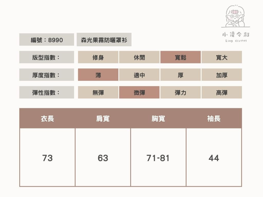 商品詳情 Model:163cm / 55kg 每件商品皆為手工測量,尺寸可能有正負3cm的範圍。 下單前可私訊IG客服詢問尺寸及適合尺寸建議。 商品材質:100%滌綸 森光果霧防曬罩衫 TWD $430 TWD $430