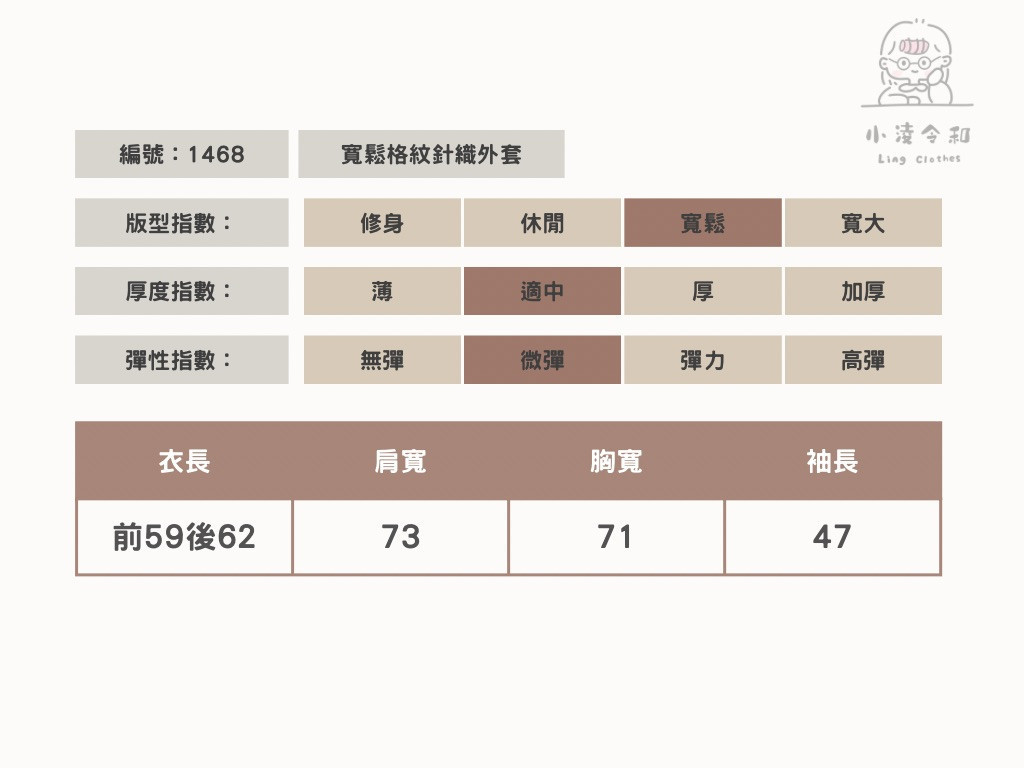 商品詳情 Model:168cm / 65kg 每件商品皆為手工測量,尺寸可能有正負3cm的範圍。 下單前可私訊IG客服詢問尺寸及適合尺寸建議。 商品材質:45%棉 25%滌綸 30%黏膠 寬鬆格紋針織外套 TWD $790 TWD $790